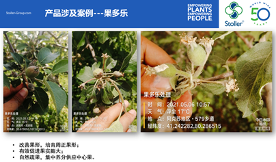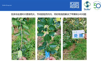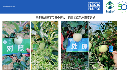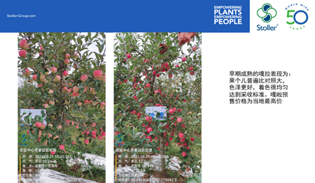 今年上半年苹果受整体市场行情的影响,苹果价格比较低迷。受到了市场影响,多数果农对于苹果的投资失去了信心,加之庆阳地区7、8月份干旱天气影响,早熟苹果嘎拉产量和品质普遍较低。但从市场情况看,生产高品质的苹果是果农收益的唯一出路。过去几年时间里追求高产导致大小年日益严重,树体衰弱,果实品质降低,最终收益减少。提升果品品质必成为果农所追求的目标。世多乐为苹果提质增产,和全国农技推广中心合作了两年,在北方各苹果产区均取得了显著成效。