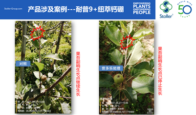 用耐普9 500倍+纽萃钙硼1000倍,在苹果套袋前叶面喷施两次。达到缓解新梢旺长,节省有机养分;新梢老熟快,新梢叶片由消耗者快速转变为制造者;累积有机养分,供给果实发育,促进果实快速膨大;使春梢健壮、自然停长,叶片增厚、浓绿;同时补充钙、镁、硼等营养元素,防治后期苹果苦痘病、水裂纹的发生。